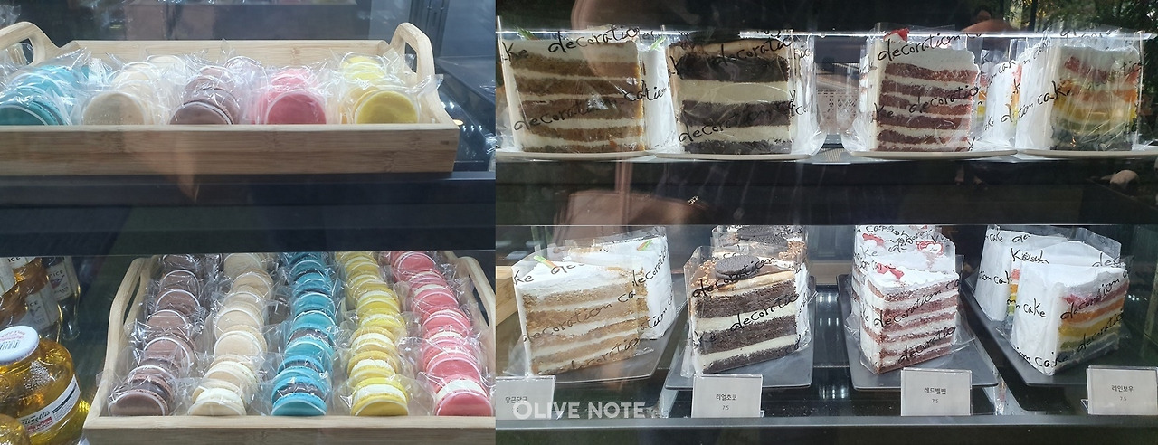 하지만 다양한 메뉴 구성만큼은 정말 좋았는데요. 사실 카페에서 세트 메뉴는 별로 내놓지 않잖아요. 그런데 커피+케이크, 커피+마카롱, 커피+마카롱+케이크 등 세트 구성이 아주 다양하더라고요. 커피보다는 케이크과 마카롱이 제 입맛을 사로잡았는데요. 당근케이크는 너무 달지 않으면서도 어른 아이 입맛에 고루 맞았고요. 마카롱은 100% 핸드메이드 제품이라고 하더라고요.
