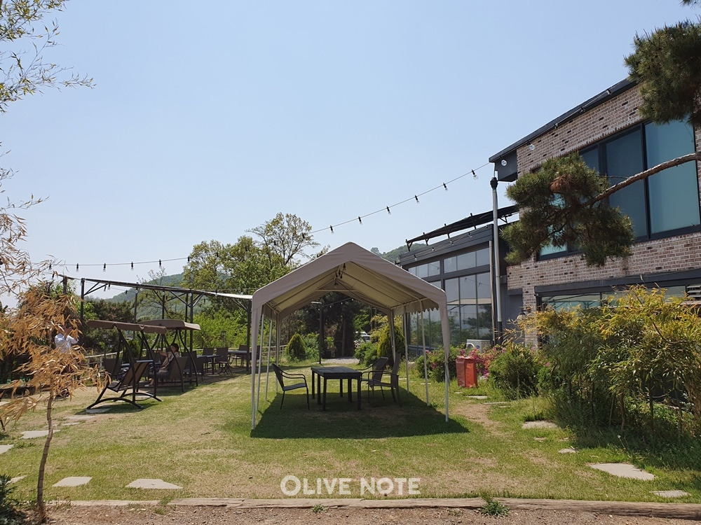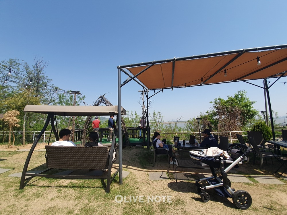 아기와 함께 온 가족들도 많았는데요. 주로 야외테이블을 선호하더라고요. 아이들은 정원에 있는 흔들그네를 타면서 놀기도 하고요. 탁 트여있어 아이들이 떠들어도 소란스럽게 느껴지지도 않았어요. 마침 미세먼지가 나쁘지 않았던 날이라 유모차를 한쪽에 세워놓고 대화를 나누는 가족들의 모습이 참 보기 좋았답니다.