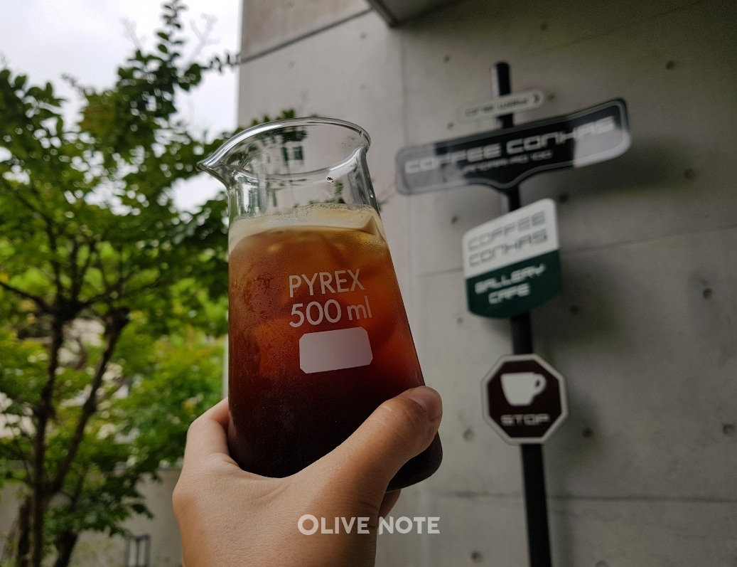 카페 이곳저곳 둘러보는 사이 커피가 나왔어요. 연희동 콘하스에서는 두 가지(산미가 풍부한 '다크우드/나무사이로' △고소한 맛의 '오감도/비로소커피')의 커피 원두 중에서 하나를 고를 수 있어요. 저는 늘 그렇듯 고소한 맛의 오감도를 주문했답니다.