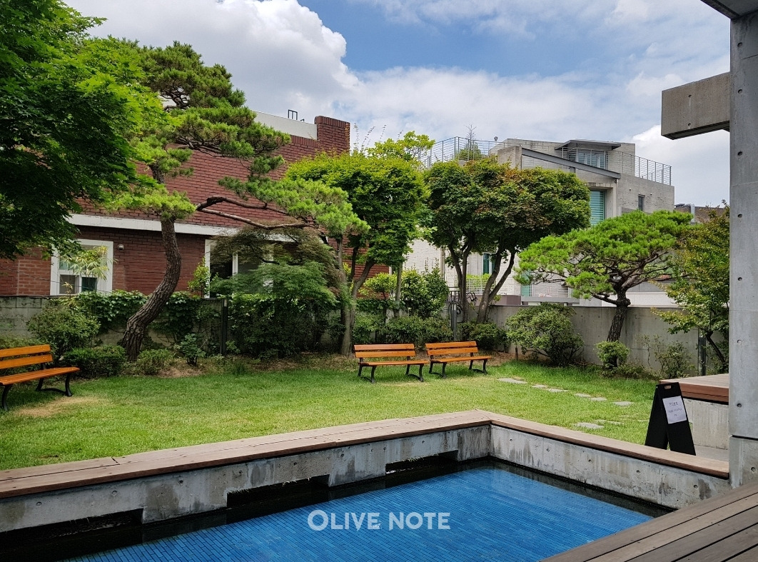 제 마음에 가장 드는 곳은 바로 정원 자리예요. 아파트에 살다 보니 정원을 만나기 참 어렵잖아요. 너무 넓지도 좁지도 않은 푸릇푸릇한 정원을 보고 있으니 내가 하고 있던 고민이 뭐였는지도 생각이 안 나더라고요. 작은 수영장(?)도 있어서 시원함을 더 배가시켰어요.