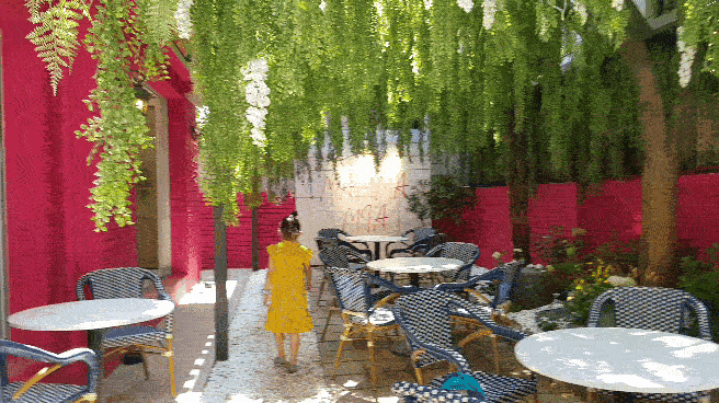 그런데 이상하리만큼 어색하지 않고 오히려 느낌 있어 보이더라고요. 아마도 진핑크와 파란색 라탄의자 그리고 머리 위에 흐드러지게 핀 흰색 등나무 꽃이 너무나도 조화롭게 잘 어우러진 덕분이 아닐까 싶습니다.