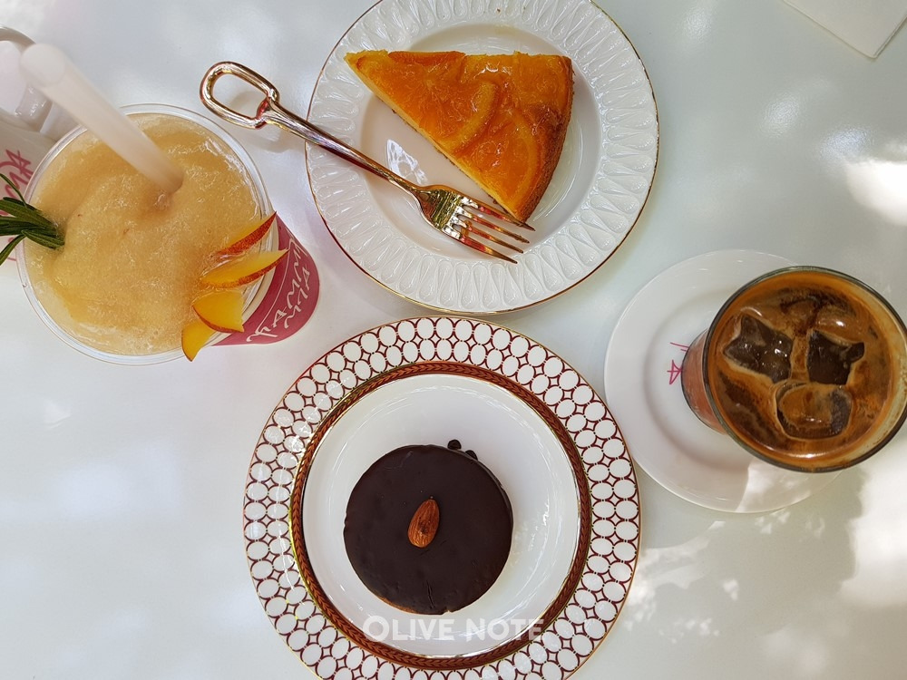 쨔안~ 플랫화이트와 아메리카노 (생)복숭아쥬스, 오렌지 콤포트 케이크(Orange comfort cake), 마시멜로우 샌드위치 쿠키(Marshmallow sandwich cookie)를 시켰어요. 플레이팅도 상당히 고급지죠? 보기만 해도 배부른 이 느낌! 일단 이집은 사진 맛집이라는 거 완전 인정!