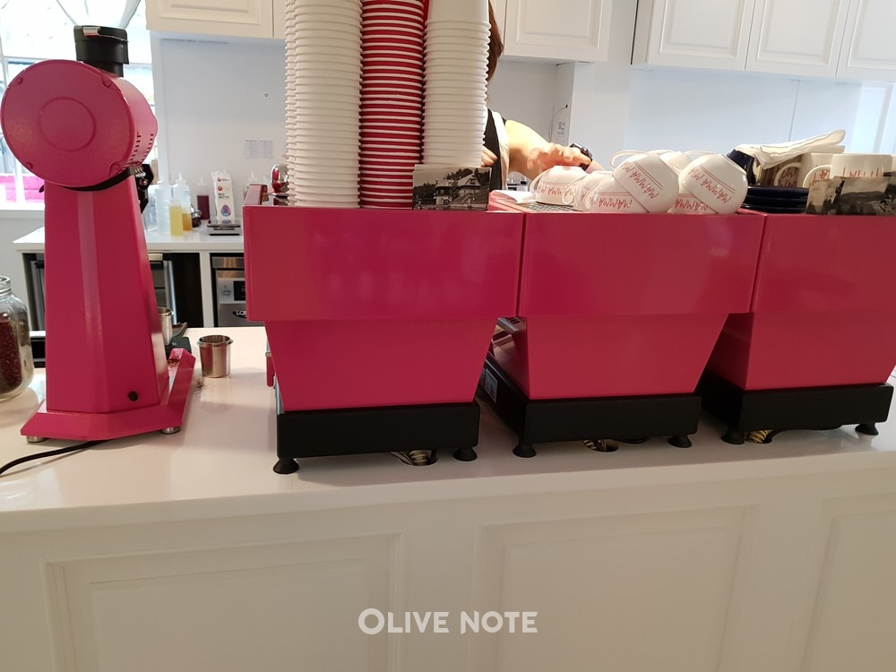 시그니처 컬러가 진핑크라서 그런지 커피 내리는 기계와 믹서, 종이컵 등도 깔맞춤을 했더라고요. 전반적으로 여자들이 좋아할 수밖에 분위기죠? 사진을 보면서 여러분도 고개를 끄덕이시리라 믿습니다.