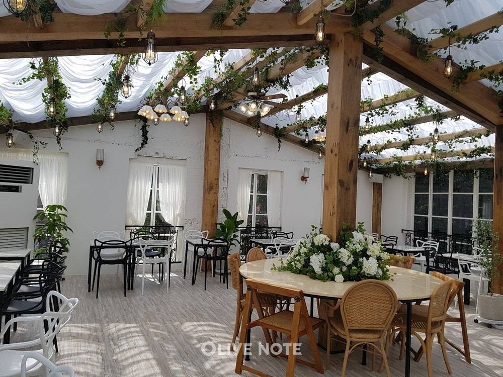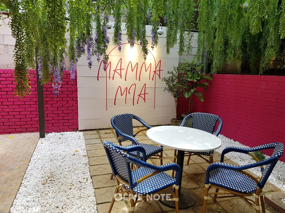 맘마미아에는 2층도 있어요. 2층 분위기는 1층과 조금 달라요. 1층에서의 첫 느낌이 워낙 강렬하기 때문에 2층의 분위기는 살짝 감흥이 떨어지는 게 사실인데요. 하지만 나름 화이트와 그린의 조화가 앞서 느꼈던 분위기와는 정반대로 시원~해요. 살짝 야외 결혼식장 느낌(?)으로 순수하고 깨끗해지는 느낌도 있고요.