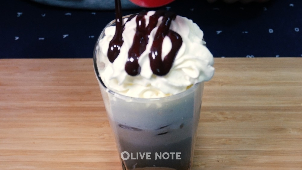 3. 마지막으로 휘핑크림을 올리고 초콜릿시럽을 뿌리면 완성!