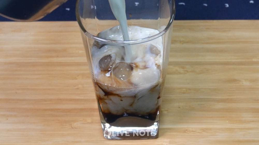 2. 1번에 얼음을 채운 뒤 우유를 170mL 정도 붓습니다.