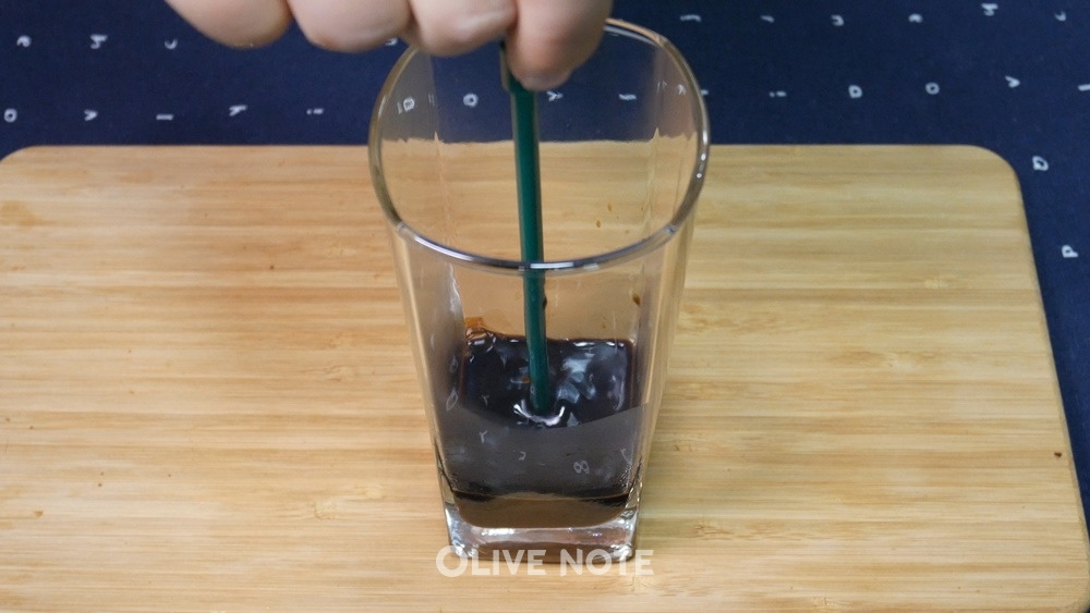 1. 인스턴트 원두커피를 따뜻한 물에 녹인 뒤 초콜릿시럽 2큰술을 넣고 잘 섞어주세요.