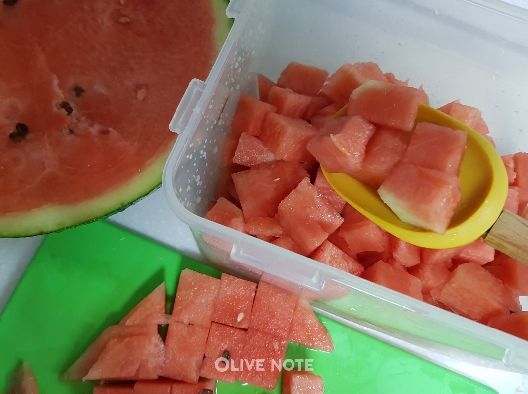 따라서 수박은 자르기 전에 껍질을 깨끗하게 씻고요. 껍질은 제거하고 속만 먹기 좋게 잘라 작은 용기에 여러 개로 나눠 담아요. 이때 수박 사이사이에 빈틈이 생기지 않게 담아 과육 표면에 공기 접촉을 최대한 줄이는 게 좋아요.