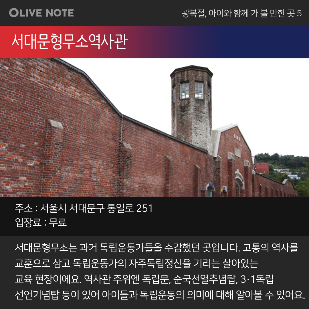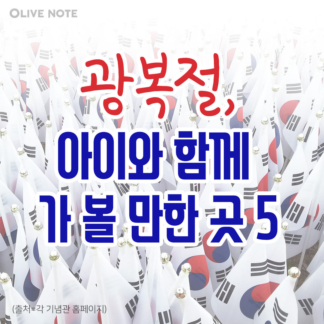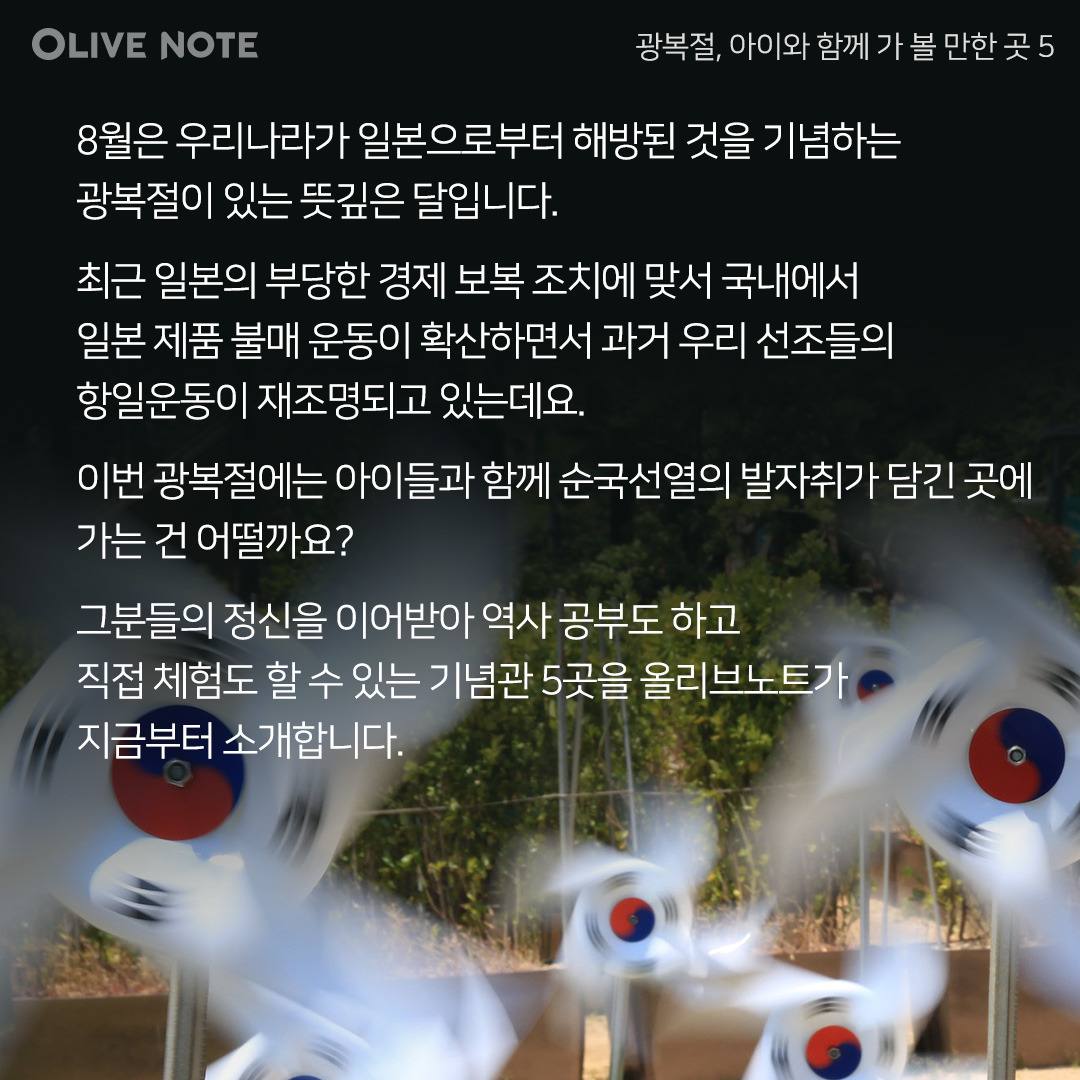 이번 광복절에는 아이들과 함께 순국선열의 발자취가 담긴 곳에 가는 건 어떨까요? 그분들의 정신을 이어받아 역사 공부도 하고 직접 체험도 할 수 있는 기념관 5곳을 올리브노트가 지금부터 소개합니다.