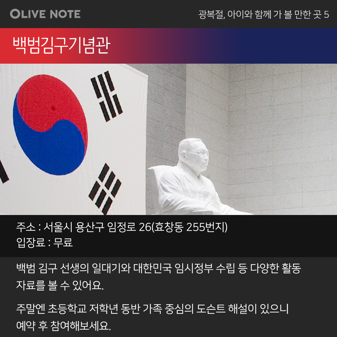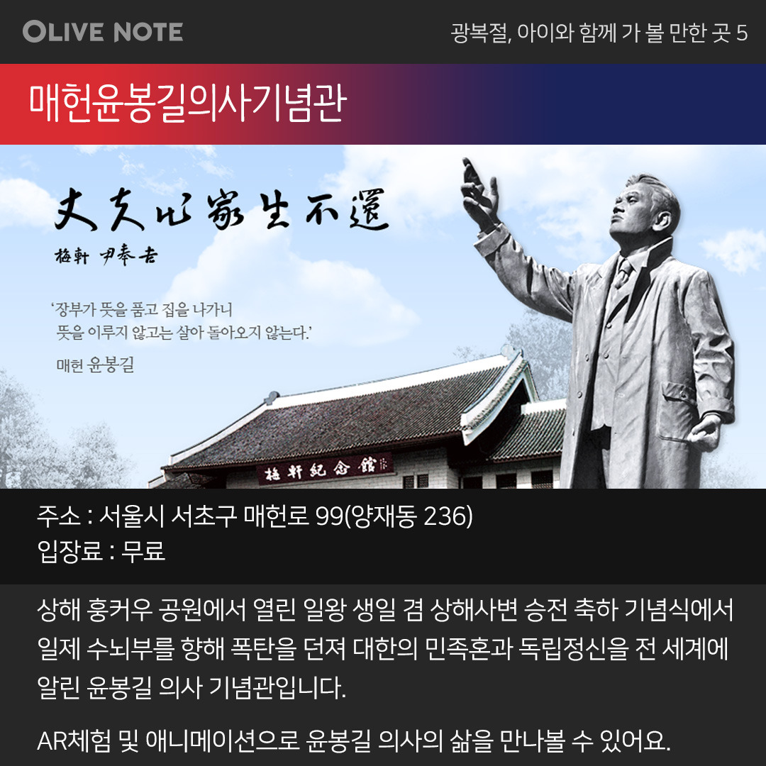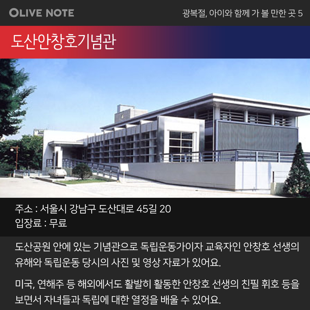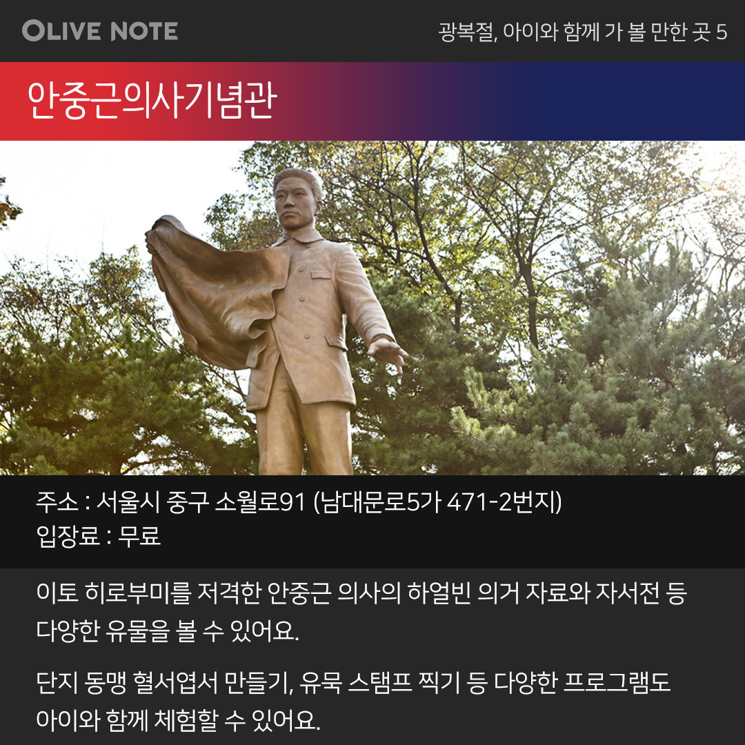 이번 광복절에는 아이들과 함께 순국선열의 발자취가 담긴 곳에 가는 건 어떨까요? 그분들의 정신을 이어받아 역사 공부도 하고 직접 체험도 할 수 있는 기념관 5곳을 올리브노트가 지금부터 소개합니다.