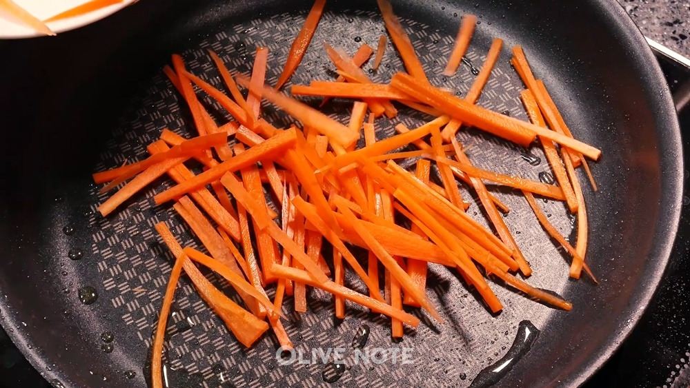 프라이팬에 기름을 두르고 양파, 도라지, 오이, 당근, 버섯, 고기 순으로 볶아주세요. 재료 색이 하얗고 양념이 묻지 않은 순서로 조리하면 설거지거리가 줄어든답니다.