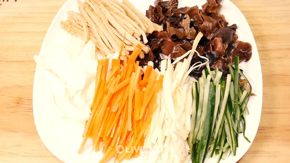 양파, 당근, 오이, 어묵을 가늘게 채 썰어주세요. 목이버섯은 뜨거운 물에 불린 뒤 손으로 가늘게 찢어둡니다. 숙주는 거두절미하고 끓는 물에 2~3분간 살짝 데쳐주세요. 도라지는 소금으로 바락바락 씻은 뒤 물에 담가 쓴맛을 빼주세요. 고기는 핏물을 뺀 뒤 설탕 1/2t, 간장 1t, 다진마늘 1t, 참기름 1t, 통깨 1t, 후추 약간을 넣어 양념해주세요.