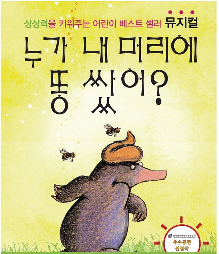 요즘 아이들은 하루가 바빠요. 어린이집(유치원)에 다녀오면 학원에 가야 하고 학습지도 해야 하고요. 그래서 기분이 처지거나 울적해 하는 아이가 있다면 엄마 아빠 손을 잡고 재미있는 연극 한 편 보면서 기분 전환을 할 수 있게 해 주는 건 어떨까요? 특히 재미있는 스토리로 아이가 배꼽 잡고 웃게 할 연극을 소개할까 해요. 바로 '누가 내 머리에 똥 쌌어?'랍니다.