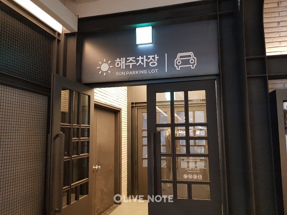 해주차장 5.5층에 주차한 후 이 문을 통해 실내로 들어와야 해요. 그리고 왼쪽으로 좌회전!