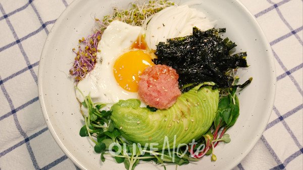아보카도 1/2개, 명란젓 1쪽, 밥 1공기, 달걀 1개, 무순 혹은 양파 약간, 어린잎채소 한 줌, 김가루 약간, 참기름 1큰술, 통깨 약간