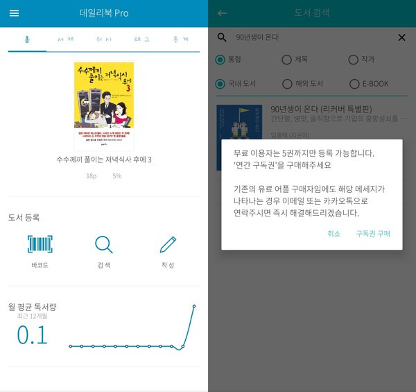 데일리북은 유료 앱(연간 구독)으로 5권까지만 무료로 이용할 수 있어요. 사진만 찍으면 모든 책이 검색되는 비블리와 달리 데일리북은 도서 검색(도서명, 저자, ISBN) 또는 바코드를 통해 모바일 서재에 책을 등록할 수 있어요. 한 권 한 권 일일이 등록해야 하죠.