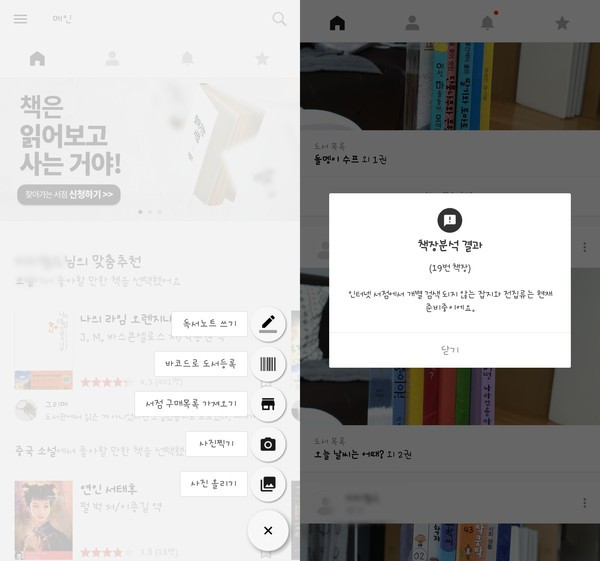 세 앱 중 구매한 책을 관리하는데 가장 최적화된 앱이에요. 비블리의 최대 장점은 책을 사진으로 찍어 모바일 서재에 목록화할 수 있다는 것인데요. 수십 권이 꽂힌 책꽂이를 찍으면 앱이 도서명과 작가, 출판사를 검색해 자동 입력합니다. 바코드를 찍어 도서를 등록할 수도 있어요.