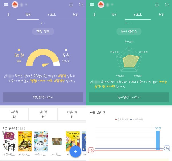 자녀별로 도서를 등록할 수 있으며 보유 도서를 분석해 영역, 장르별 통계를 내줘요. 책 육아를 할 때 부족한 영역이나 장르를 파악하기 쉽죠. 뿐만 아니라 아이가 읽은 책으로 독서 성향을 분석해 부족한 영역을 보완할 수 있는 책을 추천해줘요.