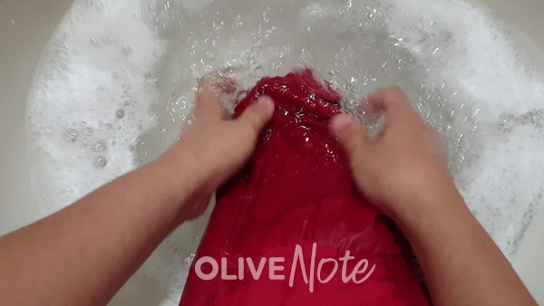 소주를 묻힌 후 중성세제를 넣은 물에 시커멓게 변한 패딩 소매 부위를 조물조물 세탁하면 검은 물이 줄줄 나오는 걸 볼 수 있을 거예요. 때가 많이 탄 부분은 솔을 이용해 살살 문질러 주세요.