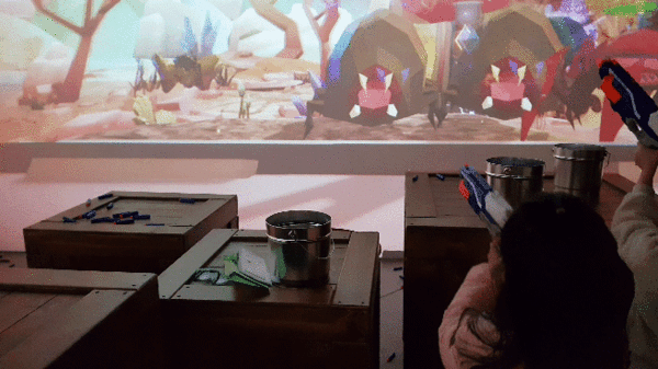 아이가 최고로 재밌다고 한 '친구들과의 긴 여정(Bulls Eye)'입니다. 장난감 총으로 화면 속 나쁜 바이러스를 퇴치하는 게임인데요. 고글을 쓰고 실내 인테리어도 전쟁터처럼 해놔서 꽤 그럴싸합니다. 장난감 총을 쏴서 총알이 바이러스를 맞추면 사라지는데요. 아이가 8살인데도 힘이 달려서 총을 장전하지 못하더라고요. 그래서 엄마나 아빠가 옆에서 총을 장전해주고 아이가 쏘게 해줘야 해요.