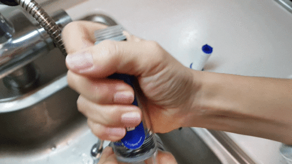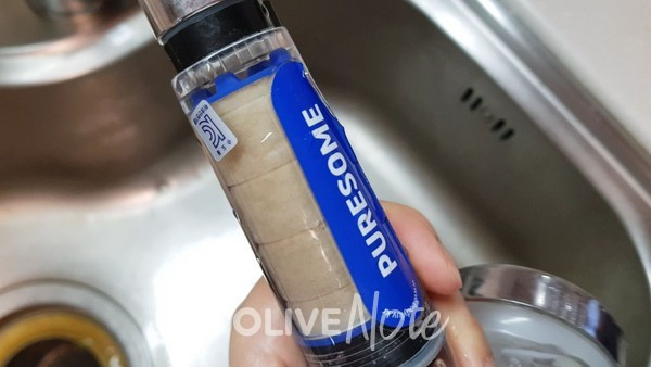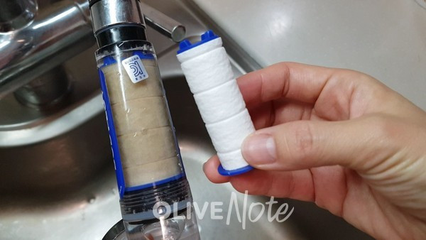 교체는 1분이면 끝날 정도로 매우 간단해요. 헤드 쪽을 돌려 필터를 빼고 새 필터를 넣은 뒤 다시 돌려주면 끝! 남편 없이도 충분히 할 수 있답니다.