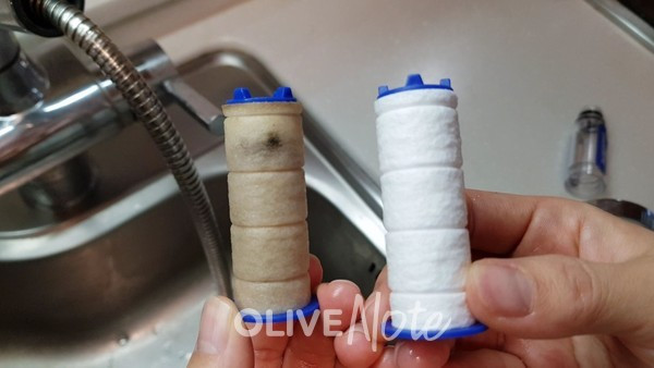 5개월 동안 사용한 필터와 새 필터를 비교하니 정말 충격적이네요. 중간에 검은색으로 변색된 부분은 대체 뭘까요. 제조사인 바디럽 측에서 수돗물 속에 든 먼지와 불순물 녹 등이 쌓인 거라고 하니 그렇다고 봐야겠죠?