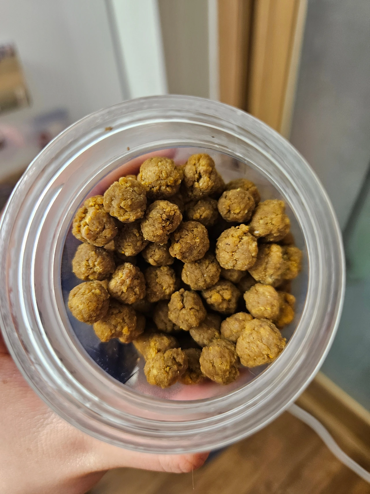 사료환. 예전에 네가 변비(!)였을 때 식이섬유 보충제를 먹여야 하는데, 네가 깨작거리고 말았어서 내가 그거 다 갈아서 물이랑 섞어서 뭉쳐가지고 알약처럼 만들어줬던 거 기억나?