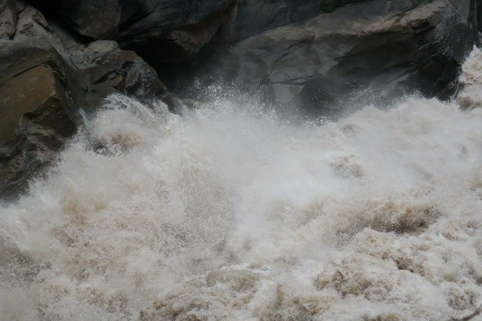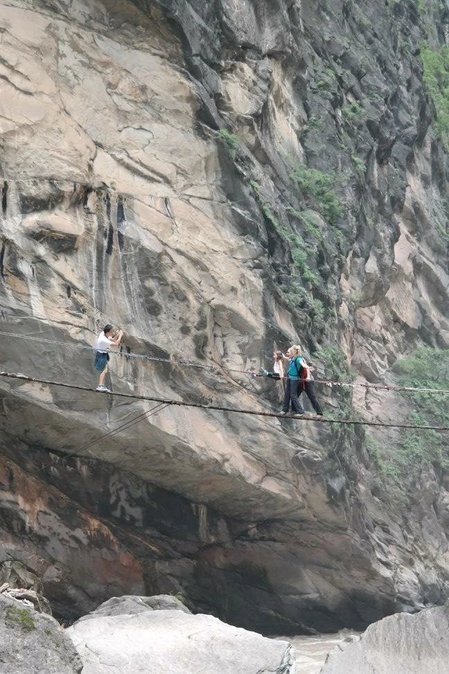 지그재그 내리막을 끝도 없이 내려갔다. 점점 내려갈수록 우르릉 소리가 가까워진다. 바로 그 호랑이 소리. 반듯반듯한 대리석 바닥에 커다란 호랑이 동상까지 있었던 상호도협과 달리 중호도협은 조만간 끊어질 것 같은 흔들다리에 중호도협이라 쓰여진 돌 정도가 사람 손을 탄 전부였다. 그만큼 우렁찬 물살에 더 가깝게 다가갈수 있었다. 박력있는 호랑이 물살에 힘을 잔뜩 얻은 것 같다. 그럼 이제 신나게 올라가볼까?