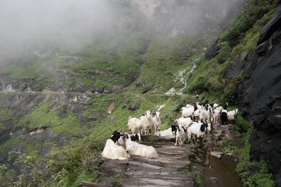 그렇게 중도객잔의 환상적인 하룻밤은 손살같이 지나갔고, 둘째날 다시 걷기를 시작했다. 폭포도 지나고, 염소떼도 지나고 어제보다 길이 더 다채로운데, 역시 평평한 테라스다. 이렇게 몇시간을 걸어 종료지점인 티나객잔에 도착했다. 점심으로 무얼 먹을까 하다가, 객잔 마당에서 마침 막 따온 야생버섯을 흥정하는 걸 보고서, 저 버섯요리를 달라고 외쳤다. 아니나다를까, 내가 지금껏 먹었던 가장 향기로운, 아니, 전혀 다른 종류의 버섯이다. 인생버섯 요리까지 끝내고, 이런 한량컨셉으로 여행을 끝내나보다 했다.