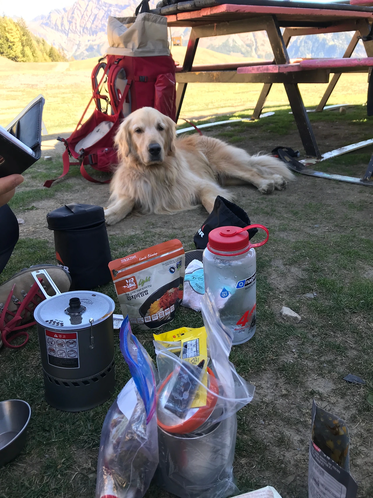 여느 날과 같이 장군이 누나는 전투식량 비빔밥, 우리는 알파미, 블럭국, 멸치 반찬이다. 그런데 오늘 아침 엘리자베따 산장에서 챙긴 버터가 신의 한수였다. 알파미에 버터를 넣었더니 그 팍팍했던 밥에 풍미가 돈다! 아, 왜 이걸 이제야 알게 된거야?! 생각보다 만족스러웠던 점심이었다.