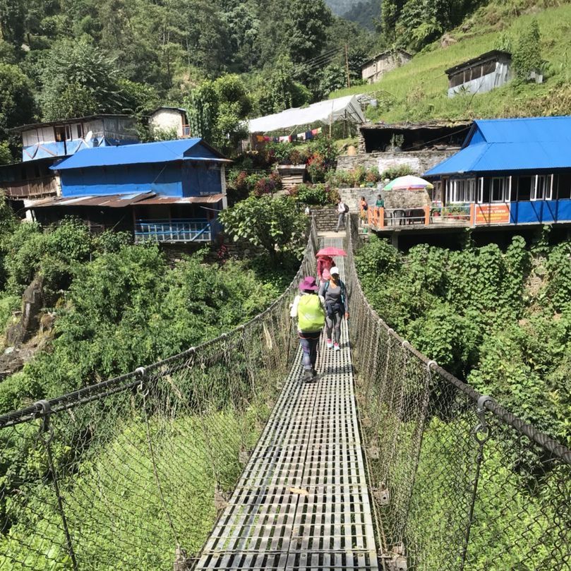 점심을 다 먹고 다시 신발끈을 묶는다. 이 긴장은 3천 계단이 기다리고 있다는 것 때문일까! 먼저 아래가 다 보이는 흔들 다리로 계곡을 건넌다. 나중에 알게 되지만 이게 안나푸르나의 패턴이었다. 다리가 나오면 곧 계단이 등장한다는 뜻이다.