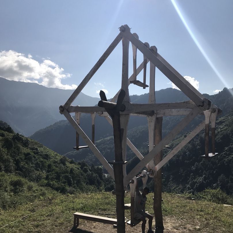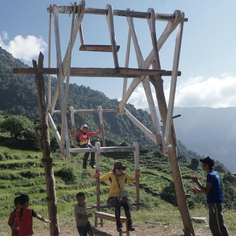 네팔 마을엔 아이들이 노는 그네가 하나쯤 있는데, 촘롱 가는 길의 한 마을에는 그네의 진화버전- 런던아이 부럽지 않은 핸드메이드 관람차가 있다. 산이 파노라마로 보이는 절벽위에.