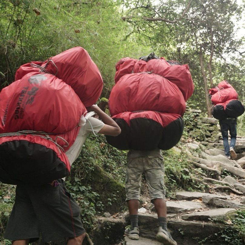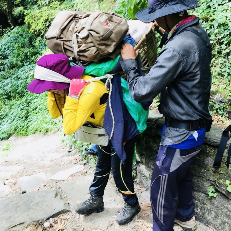 내몸 가누기 힘든 오르막에 지쳤을 오후 즈음에, 땀이 범벅된 짐꾼들이 우리를 지나쳤다. 놀라운 건, 어제 봤던 그 큰 빨간가방을 3개씩이나 묶어 머리로 이고 있는 것이다. 그것도 쪼리를 신고서. 아마도 30~40키로는 족히 넘을 그 짐은, 짐꾼의 몸 크기보다 커보였다. 그들 뒤로 커다란 플라스틱 항아리를 이고 가는 짐꾼이 있었는데, 낯익은 냄새가 난다. 바로 그 팀이 먹을 김치를 옮기고 있단다. 그들은 모든 음식재료와 심지어 그릇, 수저까지 가지고 다닌다고 했다. 게다가, 트레커가 롯지에 도착하기 전에 도착해 밥 준비를 해두고, 밥을 먹고 난 후엔 설거지를 해서 모든 짐을 가지고 다음 롯지로 이동해야 한단다. 게다가 대부분 롯지에서 김치찌개나 라면을 팔고 있다. 저런 방식이 더 싸게 먹혀서- 단지 그 이유일 것이라 짐작한다.
