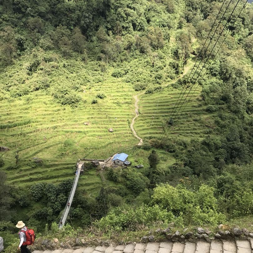 체념하고 출발을 하긴 했지만, 대체 왜 네팔 사람들은 능선을 따라 등고선처럼 길을 내지 않고 계곡까지 쫘악 내려갔다가 다시 쫘악 오르도록 길을 만들어놓은 걸까??? 바로 건너편 중턱 마을이 목적지인데 저~~~~~~기 맨 아래 계곡까지 갔다 올라와야 한다니, 억울하다. 만만한 디펜드라에게 농담반 진담반 징징거렸더니, 이 착한 청년이 하는 말이 “미안합니다...”. 아차...디펜드라가 무슨 죄야...