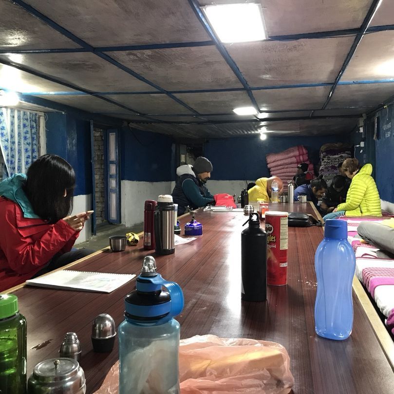 롯지도 이제 진짜 산장같다. 침대(나무박스?) 4개로 꽉찬 어둑한 골방에 짐을 풀었다. 이것도 못구한 많은 트레커들은 다이닝룸에서 자야한다. 이렇게 다이닝룸에 트레커가 가득찼는데, 원래 다이닝룸에서 자던 가이드나 포터들은 어디서 자냐고 디펜드라에게 물어보니 뒤쪽에 숙소가 있단다. 잠깐 보여줬는데 허술하기 짝이 없는 비닐하우스다. 이 곳에서 20명 넘는 가이드포터가 모여 잔다고 했다.