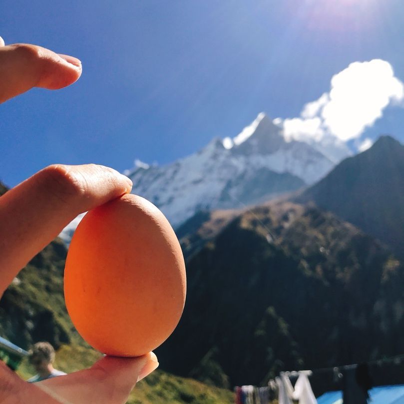 MBC에서 한껏 가까이 보이는 마차푸차레를 느긋히 감상하기로 했다. 산이 롯지를 완전 감싸는 형국인데, 파~란 하늘과 하얀 설산의 조화에 탄성이 절로 난다. 풍경을 즐기며 간식으로 먹은 삶은 계란이 또 꿀맛이다. 야들야들 딱 적당히 익은 신선한 반숙란! 풍경맛집에 계란맛집이네!