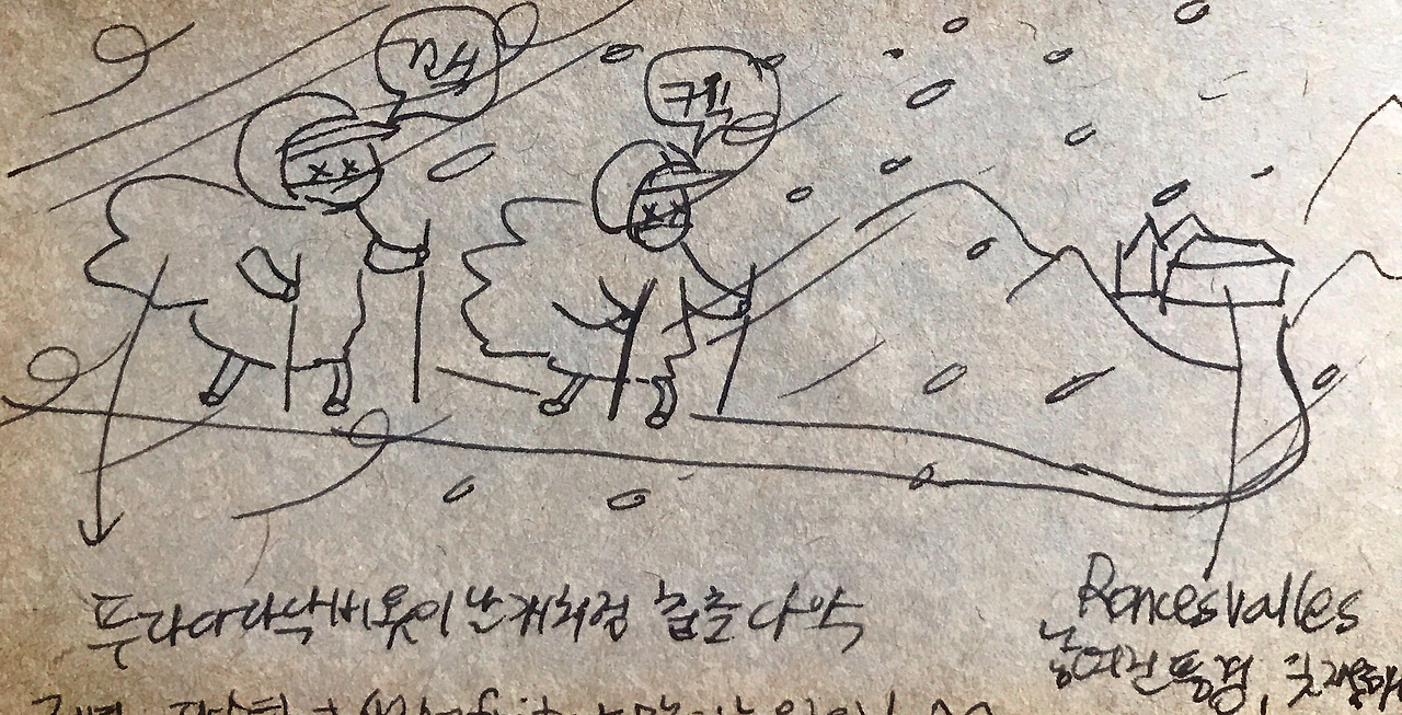 출발했던 날이 4월 10일이었는데, 아무리 이른 봄이라 하더라도 태양으로 유명한 스페인인데- 그 다음날 피레네 산맥을 넘으며 무려 눈보라(!)가 뺨을 때렸고, 이후 몇 주간 비가 오지 않은 날이 없었으며, 습한 추위에 오돌오돌 떨며 잠에 드는 날이 이어졌다. 비옷은 교복입듯 매일 입었고, 물이 새지 않는 등산화 따윈 준비하지 않았으므로 매일 숙소에 도착하면 젖은 운동화에 신문지를 넣어 말려야 했다. 늘 흐린 날씨의 영국이나 독일에서 온 친구들은 오히려 자기네 나라는 지금 해가 떴다며 억울해했다. 유럽친구들도 예상 못한 혹독한 날씨는 꽤나 오래 지속되었다.