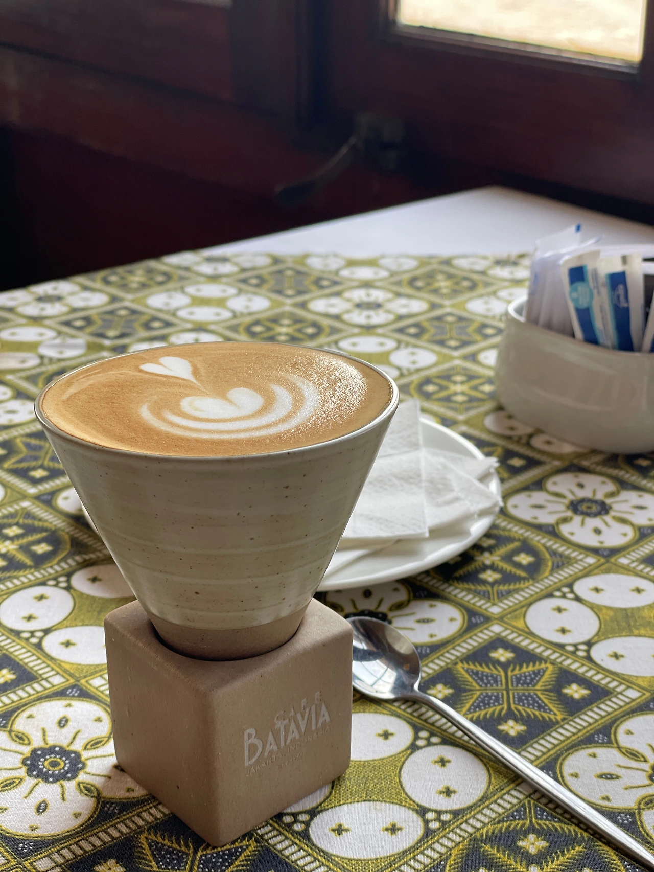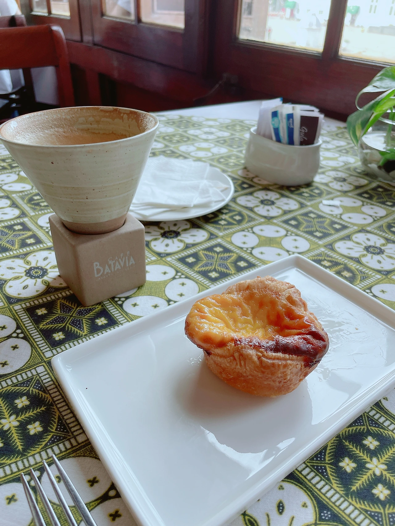2층에 광장이 내다보이는 창가자리에서 친절한 직원분에게 카페라떼와 에그타르트를 주문했다. 독특한 잔에 담긴 카페라떼는 고소~하니 커피 강국 인도네시아에서의 첫 커피 다웠다. 이 집 후기에 음식은 크게 기대말라는 걸 본 것 같은데 에그타르트는 왤케 부드러워? 캬~ 귀여운 소녀들이 자전거를 타는 광장을 보며 맛있는 걸 먹으니 행복이란 이런 것이구나 싶다. 안왔으면 어쩔 뻔 했어!