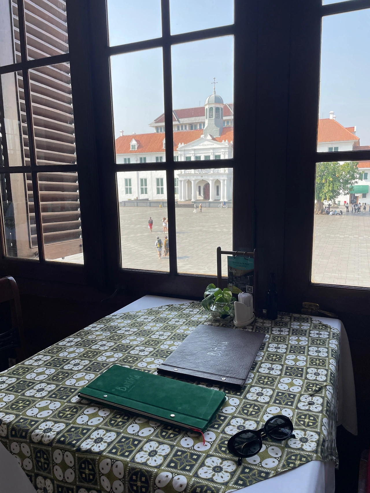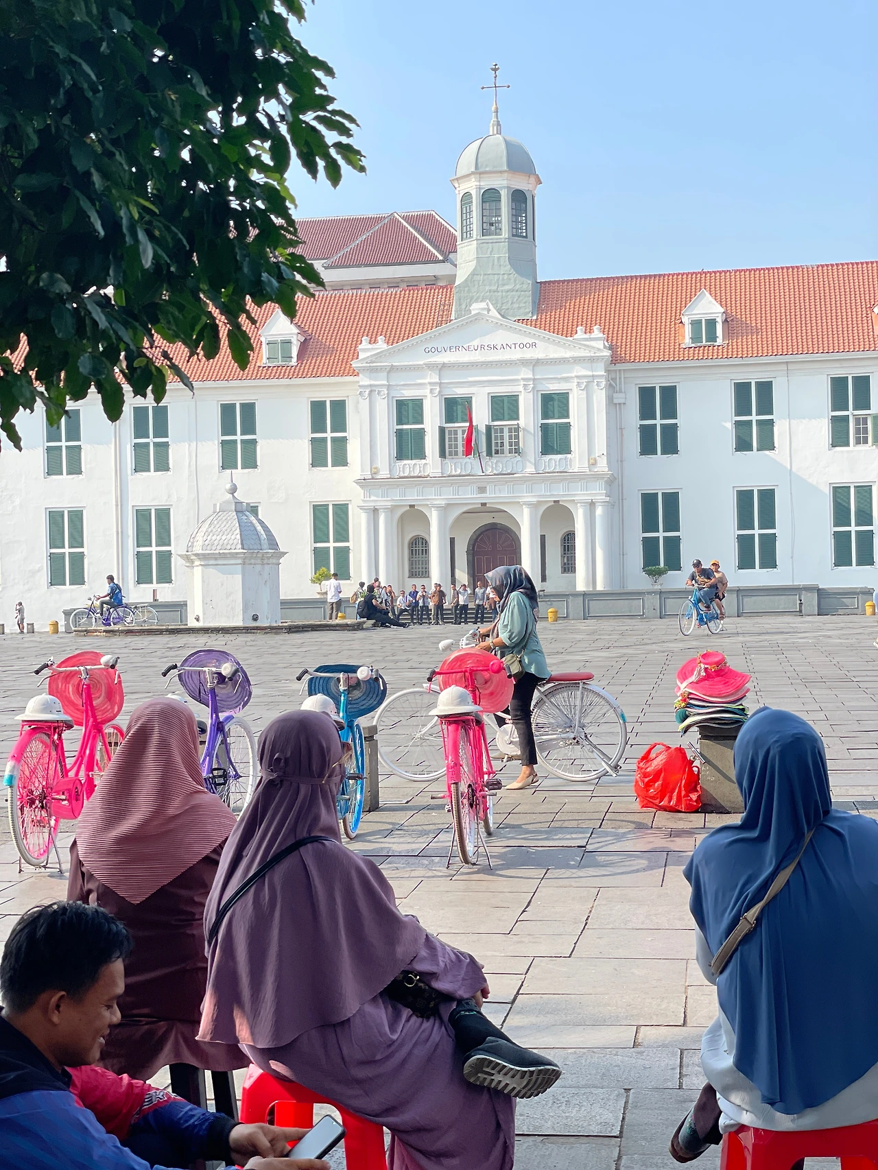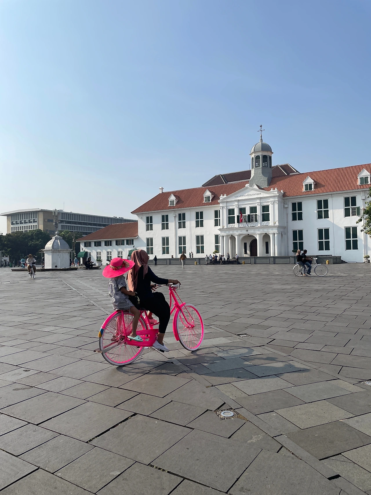 인도네시아 택시앱 고젝으로 택시를 불러 8시 30분에 카페가 있는 파타힐라 광장에 도착했다. 광장은 고풍스런 식민지 스타일 흰색 건물들로 둘러싸여 맑은 아침 햇살에 빛나고 있었다. 현지인 무슬림 소녀들 몇명이 이곳의 관광 아이템으로 보이는 형광색(!) 자전거를 타며 꺄르륵댔다. 귀엽고 아름다운 장면에 밤새 비행기를 탔지만 에너지가 솟아났다.
