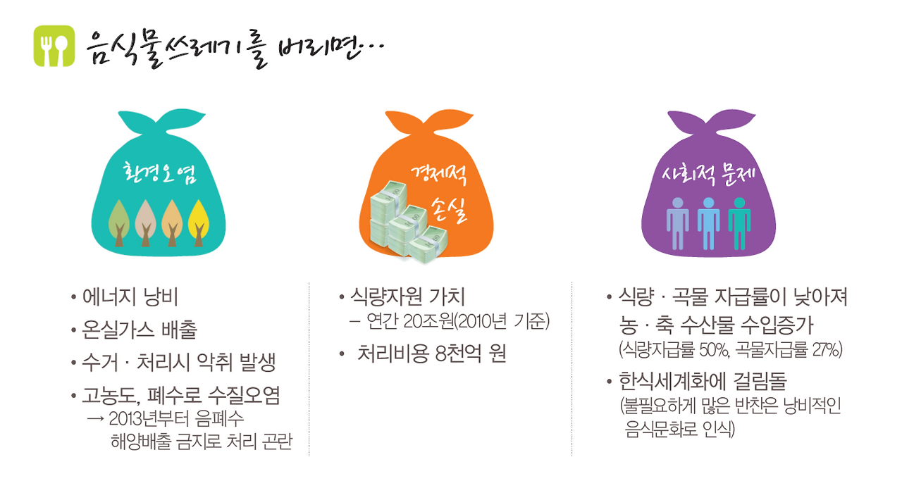 음식물쓰레기란 식품의 생산, 유통, 가공, 조리과정에서 발생하는 농·수·축산물 쓰레기와 먹고 남긴 음식찌꺼기 등을 말한다. 환경부 자료에 의하면 전 국민이 음식물쓰레기를 20% 줄이면 연간 1,600억 원의 쓰레기 처리 비용이 줄고, 에너지 절약 등으로 5조 원에 달하는 경제적 이익이 생긴다고 한다. 일 년에 음식물쓰레기 처리비용으로 8천억 원이 들어간다는 말이다. 음식물쓰레기는 푸짐한 상차림과 국물 음식을 즐기는 우리나라 음식문화와 인구증가, 생활수준 향상, 식생활의 고급화 등으로 인해 매년 3%가량 늘고 있다. 국내에서 발생하는 음식물쓰레기는 하루 1만 4천여 톤으로, 전체 쓰레기 발생량의 28.7%를 차지한다.