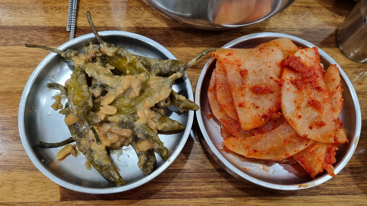 반찬은 딱 두 개, 석박지와 된장고추절임이다. 스뎅 그릇에 가득 담아왔다. 칼국수가 나오기 전에 반찬부터 맛을 봤다. 석박지를 입에 물자 달콤짭쪼름한 시원한 맛이 입안 가득 느껴진다. 된장고추절임은 청양고추를 전통된장에 묵혀서 절임으로 만든 거라 매콤하지만 된장 고유의 맛이 입혀져 구수하기까지 하다.