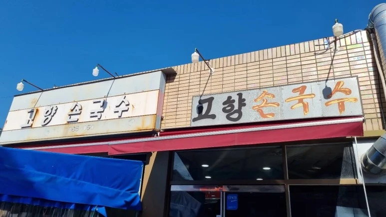 대구 동구 불로시장에 위치한 고향손국수. 허름한 간판에도 손님이 벅시글하다
