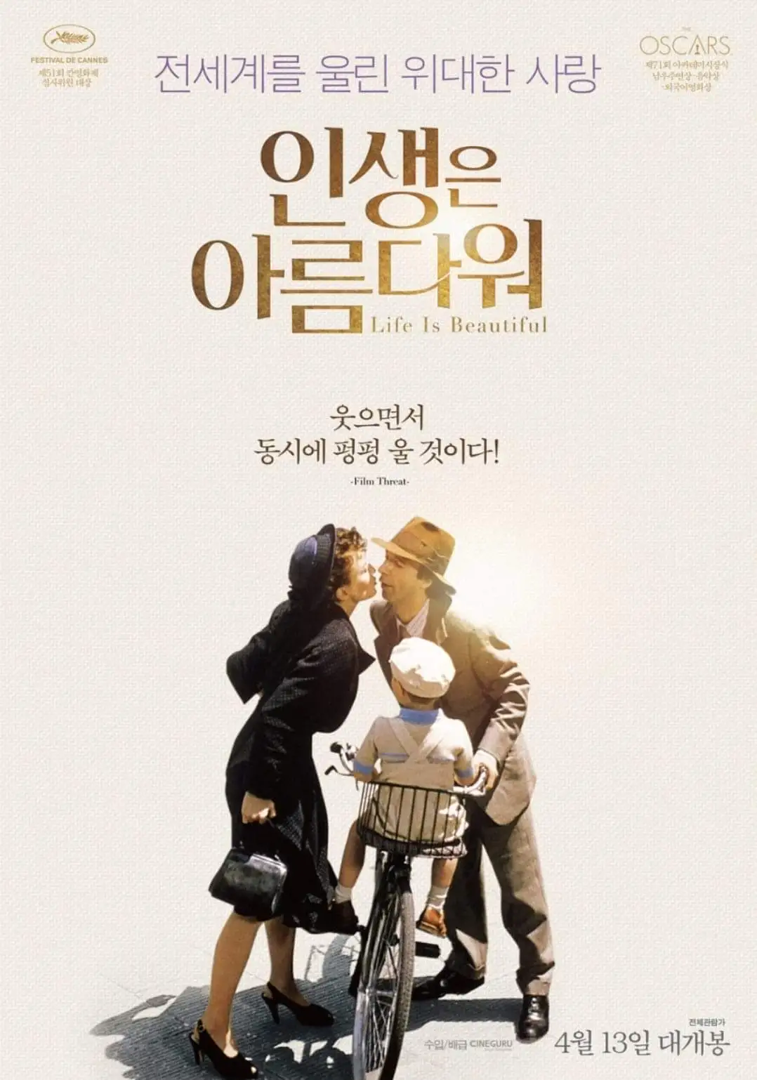 우울한 전쟁 이야기이지만 블랙코미디의 정수를 보여준 <인생은 아름다워>, 아들 조슈에와 아내를 태워 학교 앞에 내려주고 키스하는 저 장면, 귀도가 살아있을 때 마지막으로 행복했던 순간이었다. 오늘과 지금이 가장 행복한 순간이라는 것을 잊지 않으며... 인생에서 가장 아름다운 사진 한 장을 남겨보는 건 어떨까.