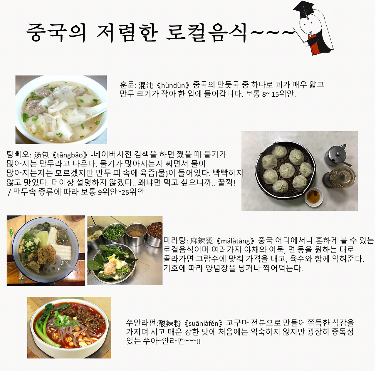 조금 괜찮은 레스토랑에만 가도 일인당 식사비에 100위안(元)(2017.1월 환율(171)기준 약 17000원 정도)이 넘는 경우가 허다하지만 동네 로컬 음식점에 가면 35위안(약 6000원) 정도이면 한 끼를 먹습니다. 중국 사람들이 좋아하는 훈둔(混沌《hùndùn》피가 얇고 크기가 작은 만두국으로 중국 사람들이 좋아하는 매우 대중적인 음식)집에 가면 훈둔 한 그릇이 8~15위안입니다. 편의점 도시락은 20위안(약 3500원 정도)이 넘는 경우가 거의 없습니다.