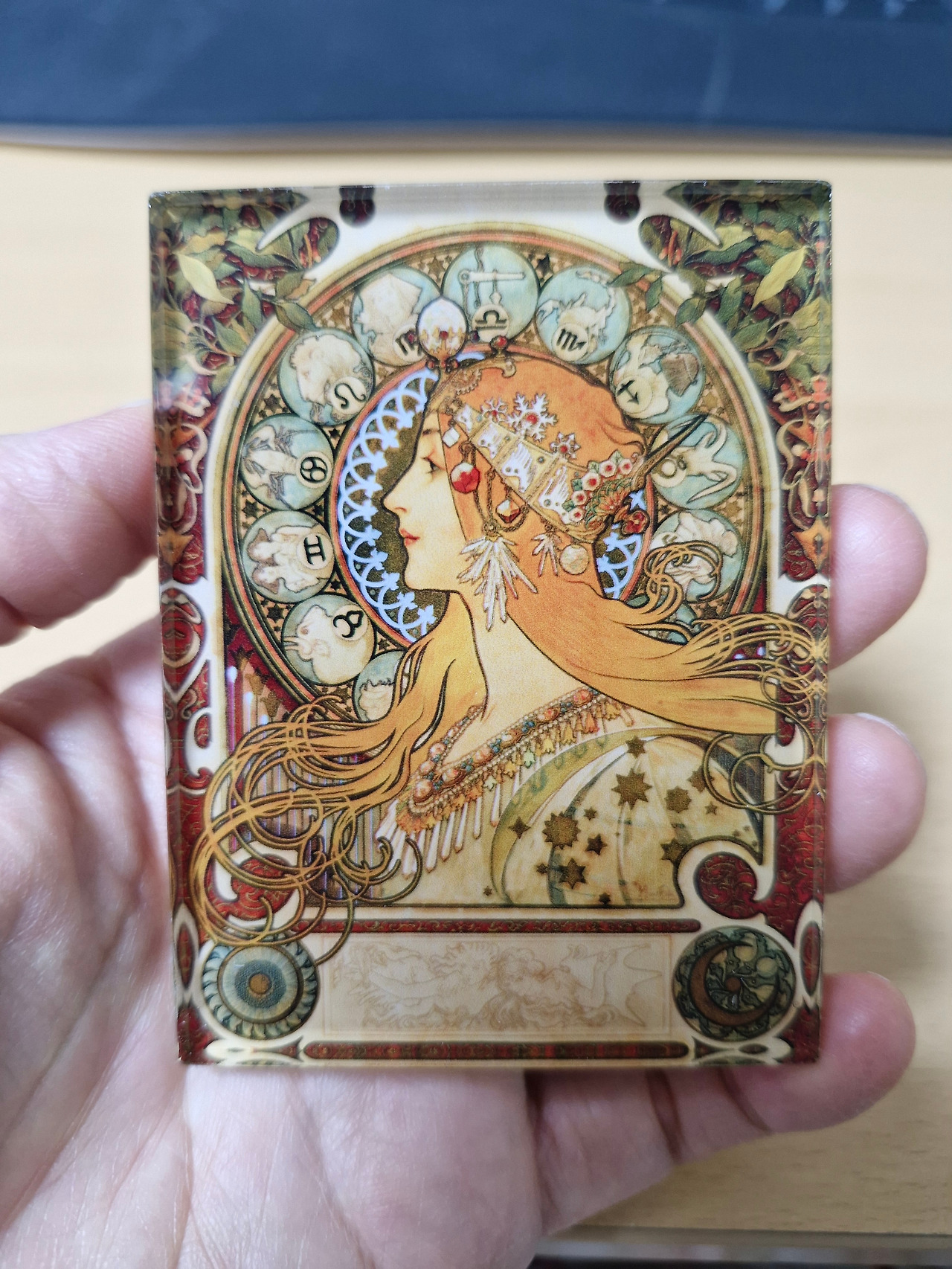 2년 전 내가 겪은 일 기억해? 교권 침해. 교통사고 같았던 그 순간을 반복하여 떠올리다 피폐해진 나는 잠시 학교를 떠나 있어야 했어. 가만히 누워 있으면 자꾸만 땅속으로 꺼질 것 같아 무작정 집을 나선 어느 날, 알폰스 무하 미디어전시 광고가 내 눈에 들어왔지. 훌쩍 찾아간 전시장의 관람객은 나뿐이었어. 벽면을 가득 채운 그림 속 여인들이 음악에 맞춰 일렁이며 나를 휘감는데 황홀하더라. 그 느낌을 간직하고 싶어서 나오는 길에 작은 마그넷을 샀어.