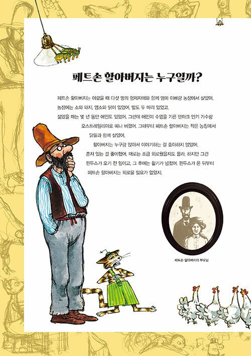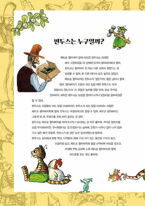 할아버지와 고양이의 이야기야. 이 둘은 절친이지. 할아버지의 이름은 페트손. 할아버지는 작은 농장에서 닭들과 함께 살고 있고 사람들과 이야기하는 것보다 혼자 있는 걸 좋아해. 그리고 곰곰 생각하는 걸 즐겨. 어떤 생각을 하냐면, 재밌는 생각! 예를 들면, '말하는 기계 요정' 같은 걸 생각해서 목공 기계로 만드는 거야. 채소 키우는 게 좋아서 채소밭을 일구고, 호수에서 낚시를 하거나 수영을 하는 것도 할아버지의 즐거운 취미야. 저녁이면 부엌에 앉아서 라디오를 듣고 십자말풀이를 하고 커피를 마시지.