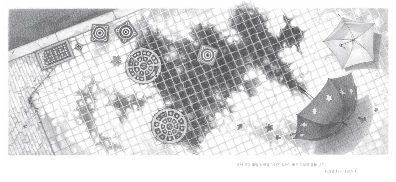 그때부터 작가는 길에서 많은 걸 발견해 낼 수 있었어. 걸음을 늦추고 유심히 주변을 관찰하면서 말이야. 어느 길에선 여우와 쥐가 마주 보고 있고, 어느 모퉁이에선 거인이 꽃에 물을 주기도 했어. 외계인이 뚜뚜뚜 신호를 보내고, 나눠 먹고 싶은 커다란 핫도그도 봤지. 어느 날은 비가 내렸어. 톡, 톡, 톡, 바닥에 빗방울 점이 찍히고, 악어가 슬금슬금 나오기 시작해. 벚꽃 잎이 모여 만든 꽃 악어가 말이야. 사슴 친구들은 굴속으로 들어가 비를 피하고 있어. 비가 그치자 요술사 아줌마가 나타났네!