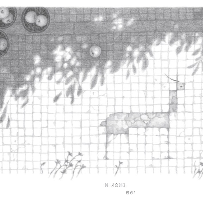이 그림책의 작가도 걷다가 사슴을 발견했다. 삭막한 도심의 길을 걸어가다가 보도블록만 깔려있는 길바닥에서 사슴이 나타난 것이다. 그이는 평소에도 천천히 걸으며 길에서 작고 사소한 것들을 발견하는 일을 재미있게 느끼던 사람이었다.