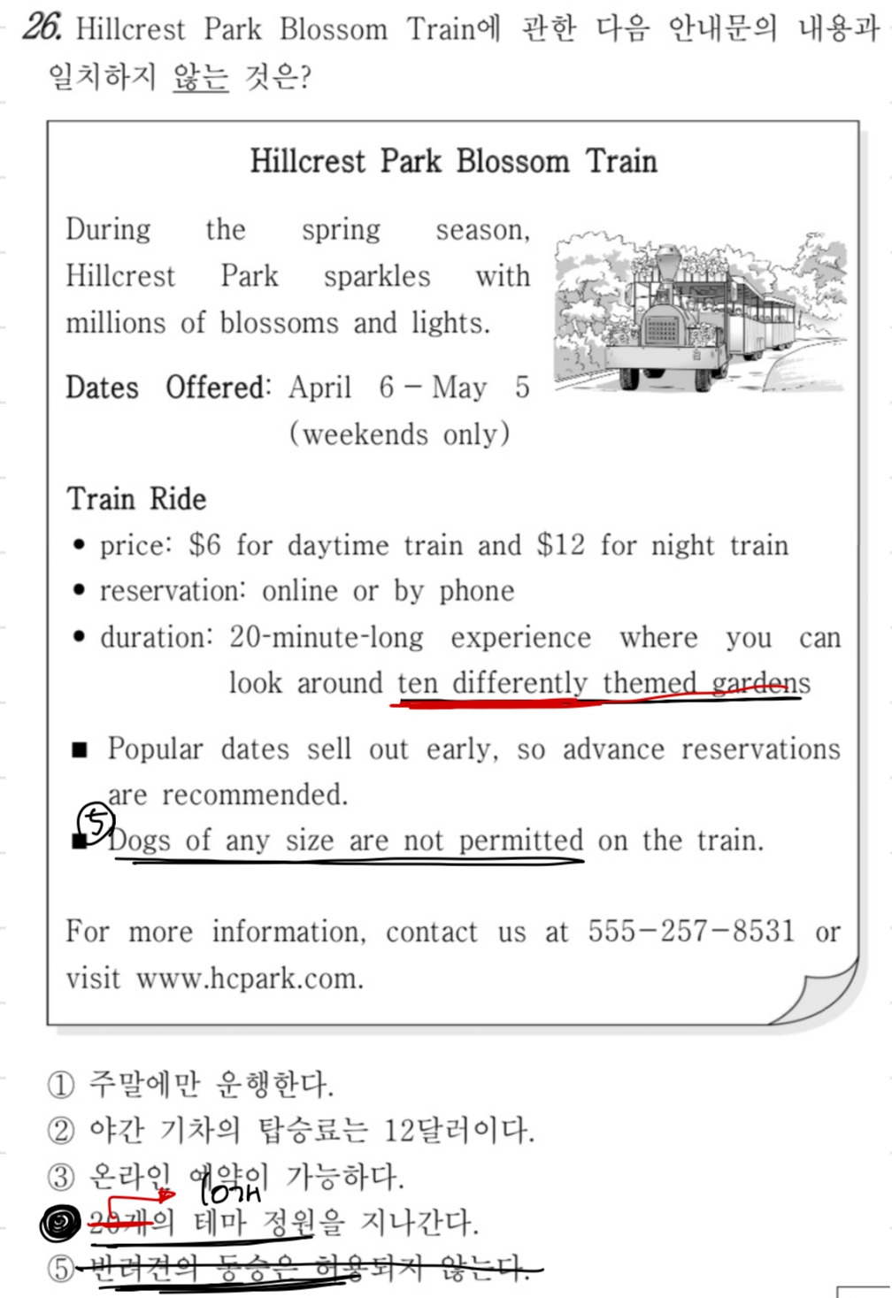 똑같은 모의고사의 26번 안내문 유형에 대해도 이 방법을 적용해 보겠습니다. 역시 안내문을 전혀 읽지 않고 5번 선지를 읽어주세요. 반려견의 동승은 허용되지 않는다고 합니다. 그럼 우리는 안내문의 뒷부분에서 반려견에 대해 서술한 부분을 찾아 줍니다. 역시나 Dogs of any size are not permitted이라고 합니다. 그럼 맞는 선지죠?