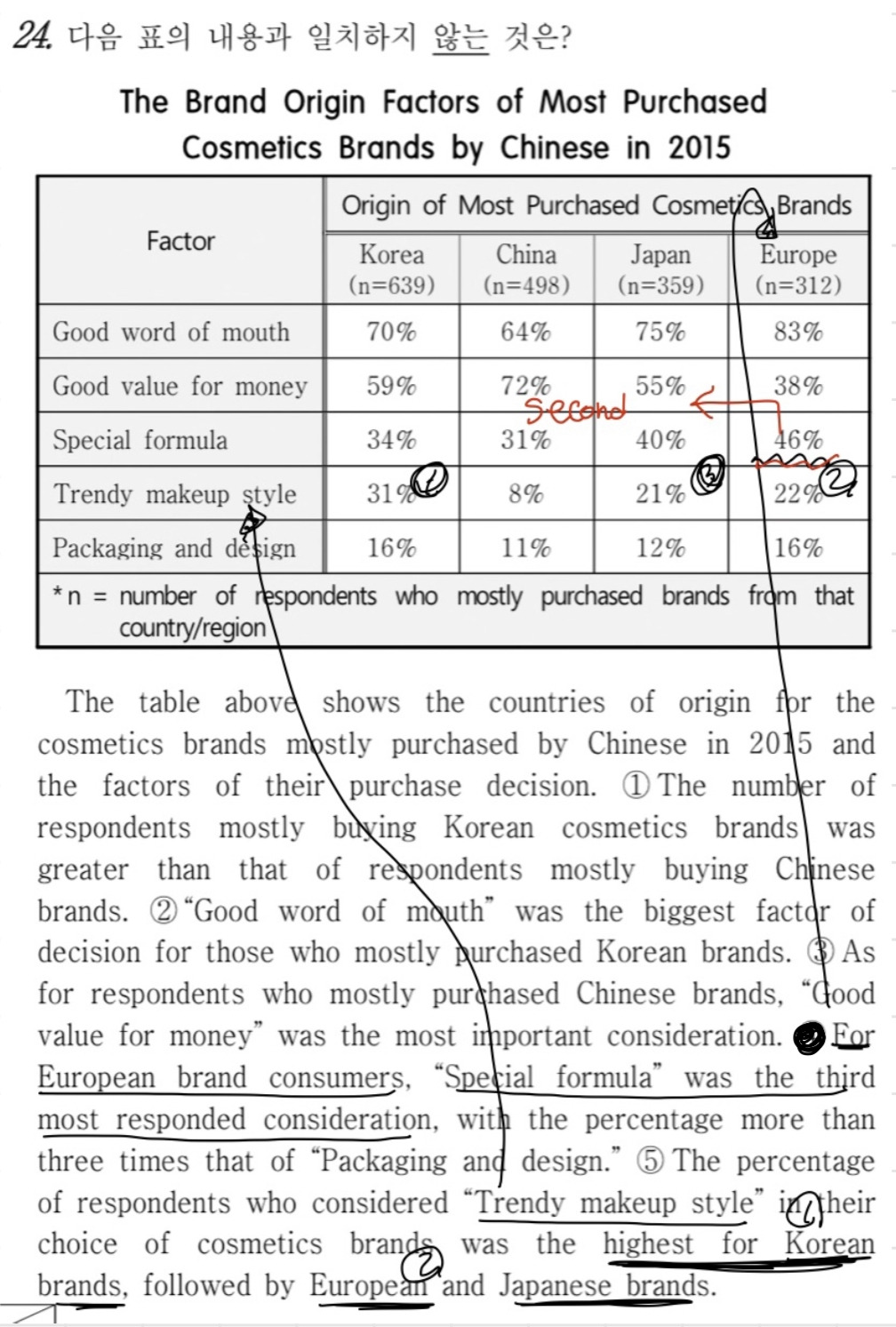 실제로 출제된 문제(2019년 고3 3월 모의고사)를 통해 이 법칙을 적용해 보도록 하겠습니다. 글의 제목이니, 도표의 제목 같은 건 모두 무시해 버리고 바로 선지 5번을 읽어 주세요. The percentage of respondents who considered “Trendy make up style”을 보자마자 우리는 위의 도표의 Trendy makeup style을 찾아줍니다. 그리고 그것이 가장 korean brands 중에 highest 하고, 유럽과 일본 브랜드가 그 뒤를 따른다고 합니다. 맞나요? 네 맞습니다. 그럼 바로 4번으로 올라가면 됩니다.